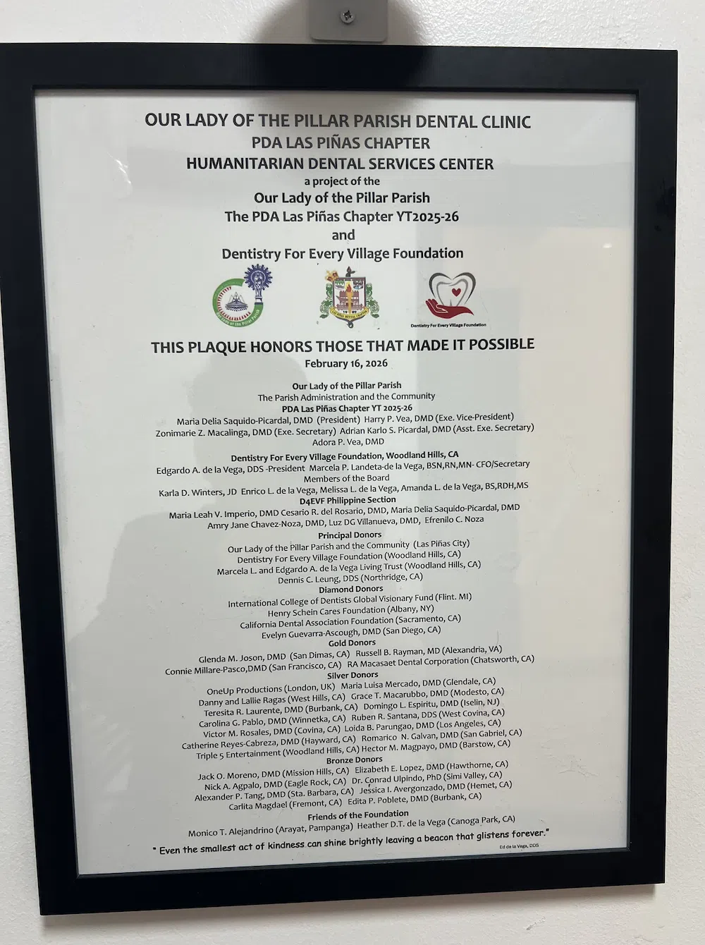 The foundation wishes to extend its sincere gratitude to the International College of Dentists Global Visionary Fund and the Henry Schein Cares Foundation for their unconditional support that allowed the completion of the dental clinic. The same goes to the numerous donors that provided resources to purchase many of the equipment and supplies, notably Dr. Dennie Leung of Northridge, California and Dr. Nelson Gaba of Las Piñas City, Philippines.