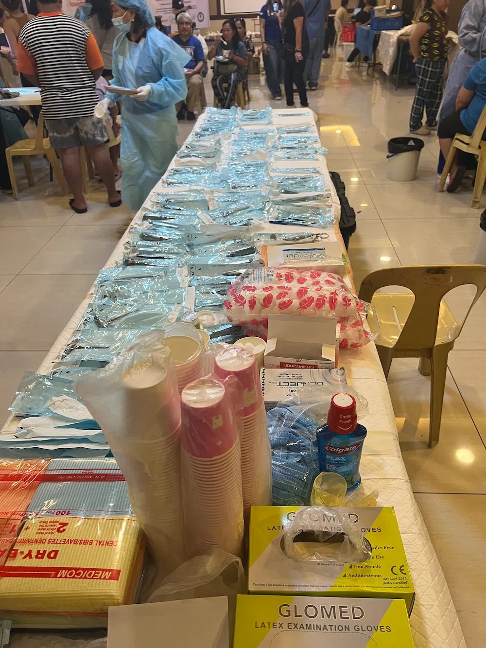 - Numerous dental supplies like PPE, 2×2 gauze, cotton rolls, disposable face masks and face shields, various size dental needles and anesthesia, toothbrushes and toothpaste, paper supplies and even cleaning solutions for the cleaning lady.