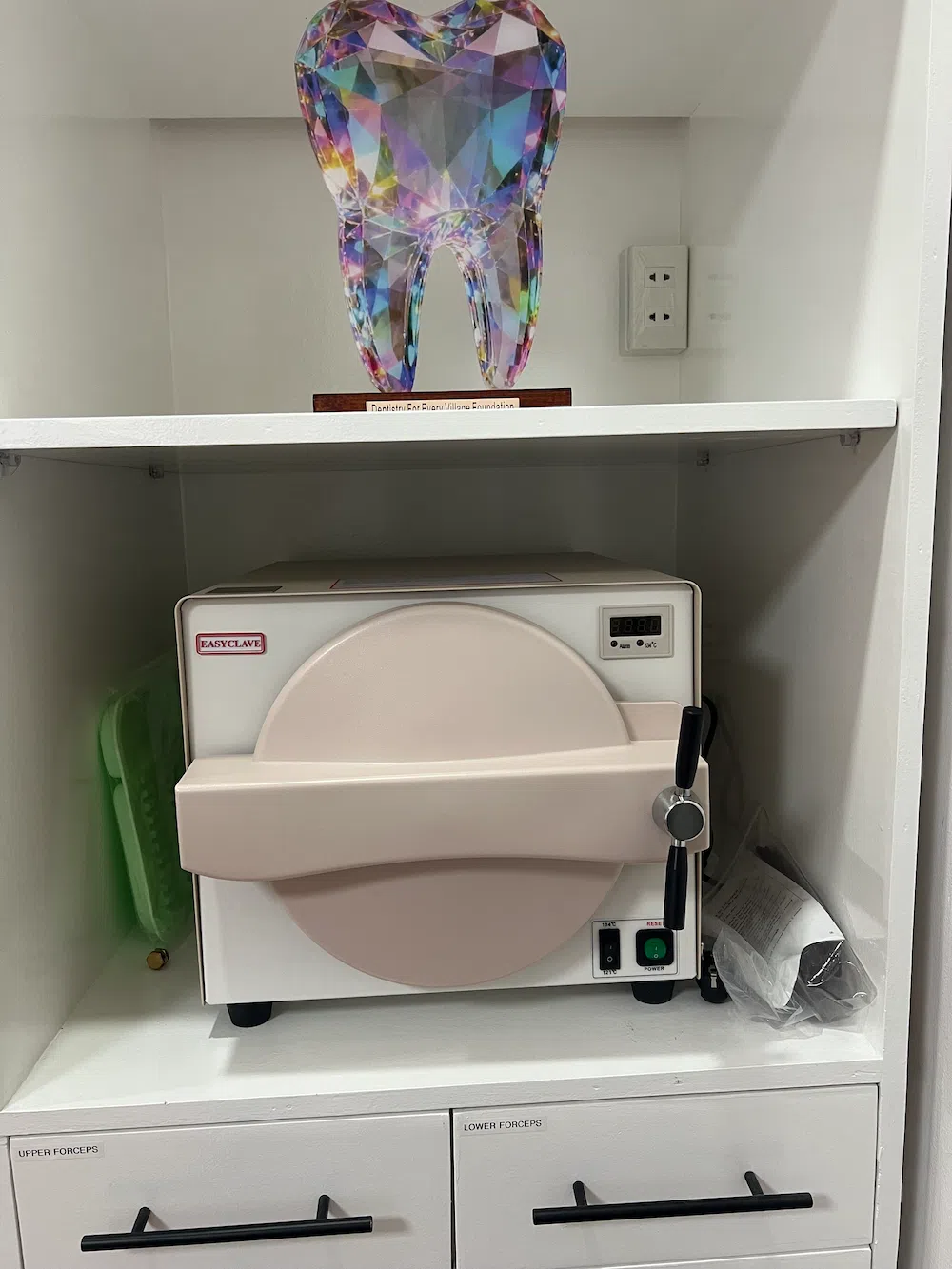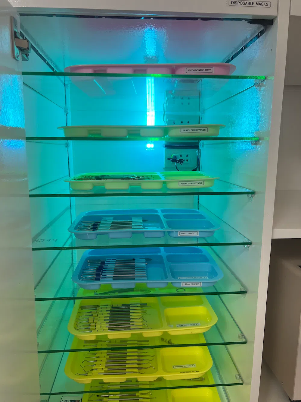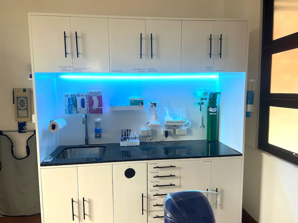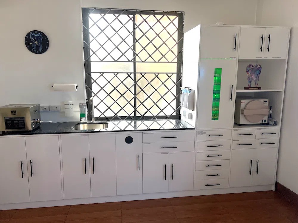 One interesting feature of the clinic is a custom designed sterilization cabinet fitted with a UV-C germicidal light bulb to house the instrument trays that contains hand instruments for restorative, endodontic procedure, oral prophylaxis and periodontic procedures. The UV-C germicidal lights keep the instruments germ free.